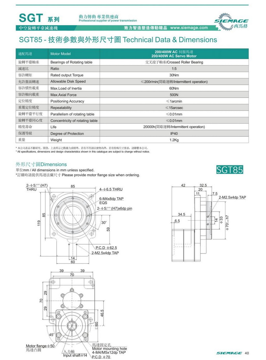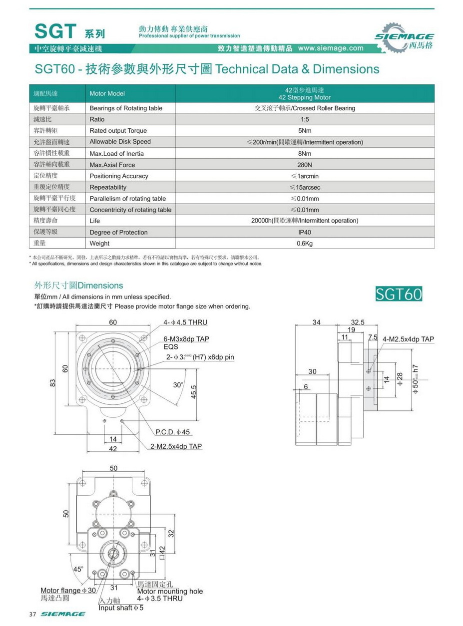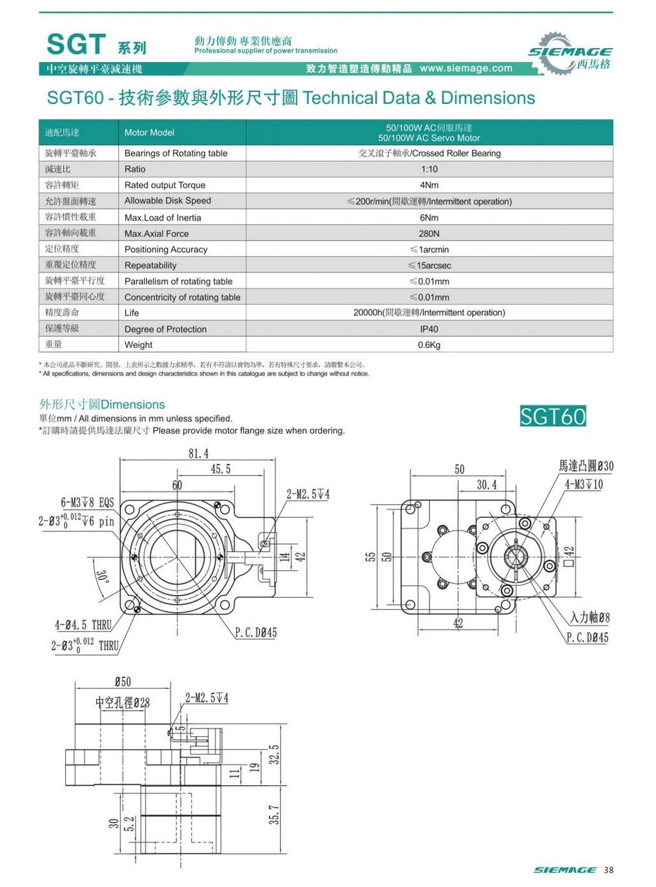 西馬格中空旋轉(zhuǎn)平臺SGT60,可配各品牌伺服電機(jī),50/100W伺服馬達(dá),各廠家42型步進(jìn)馬達(dá),步進(jìn)電機(jī)。減速比有1:5,1:10,1:18等。