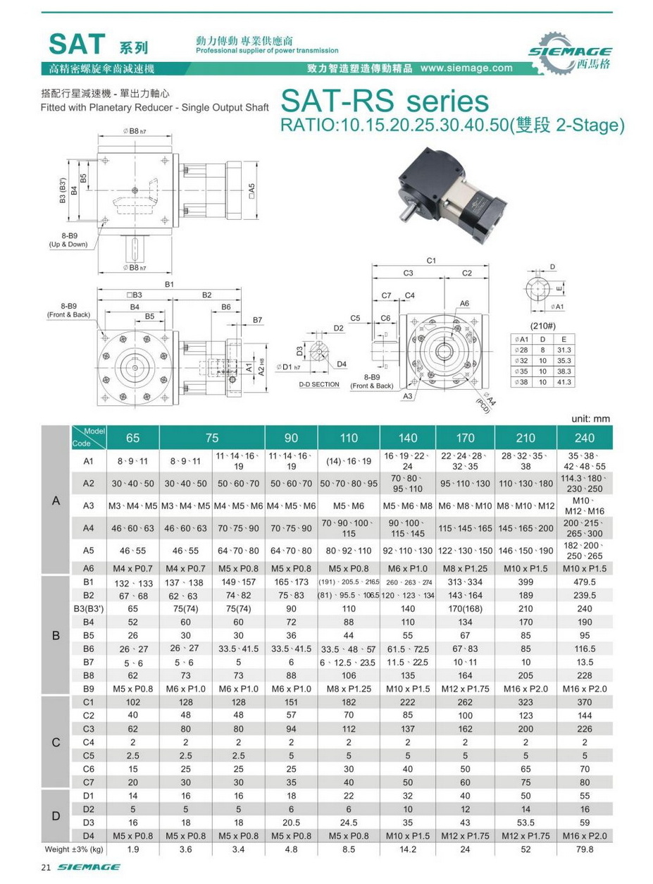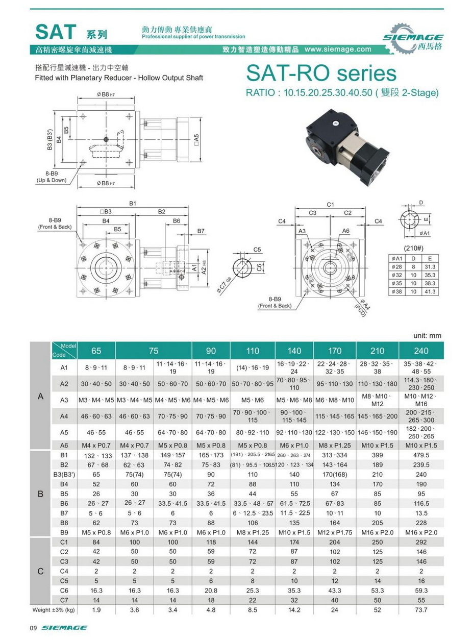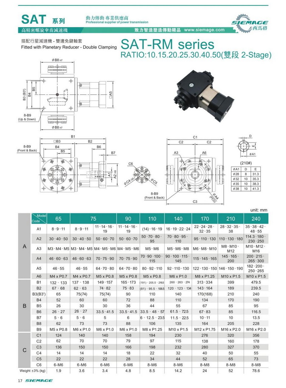 螺旋錐齒輪減速機(jī)雙級(jí)的型號(hào)有SAT65,SAT75,SAT90,SAT110,SAT140,SAT170,SAT210等,減速比有1:10,1:15,1:20,1:25,1:30,1:40,1:50等,入力可配各種伺服電機(jī),步進(jìn)電機(jī),直流電機(jī)等。螺旋錐齒輪減速機(jī)雙級(jí)入力軸及出力軸均可特殊加工,訂制,滿足各種需求。